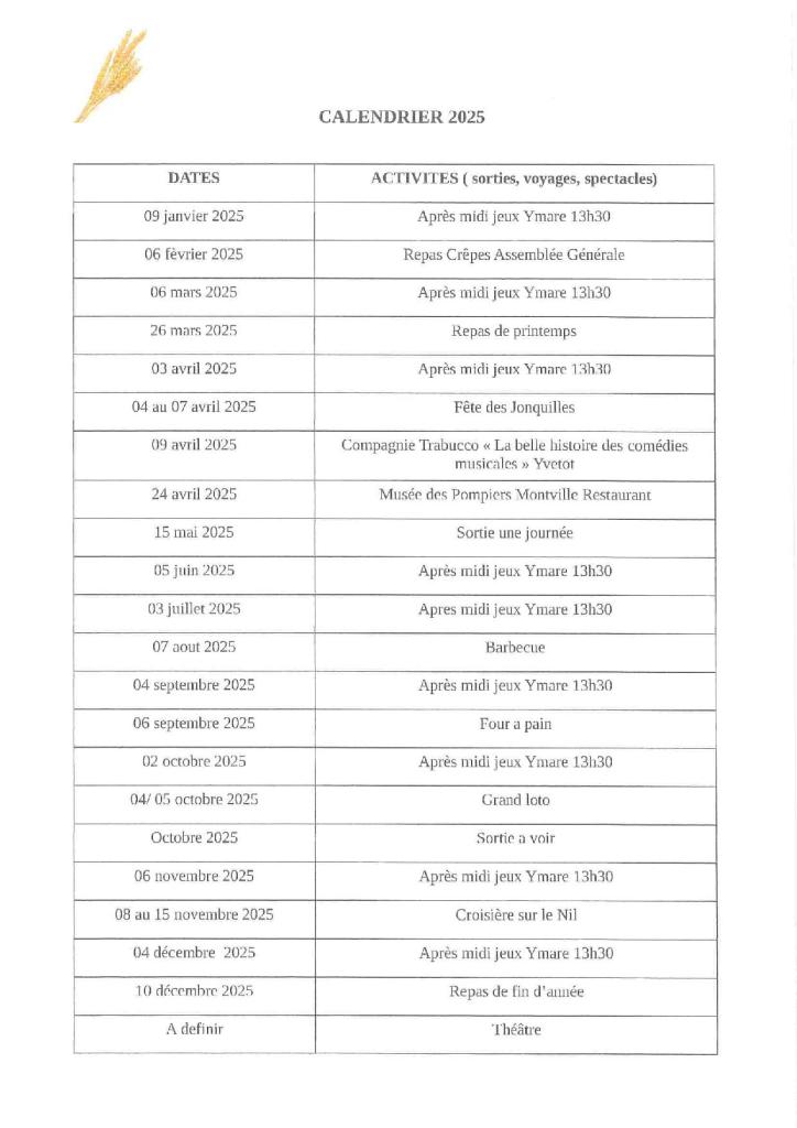 Sorties culturelles et récréatives, sorties spectacles, visites-découvertes du patrimoine local, voyage-séjour dans nos belles régions, voyage en France et à l’étranger, après-midi rencontre à Ymare etc…, et également nos traditionnels repas : de printemps, de fin d’année, crêpes et barbecue.